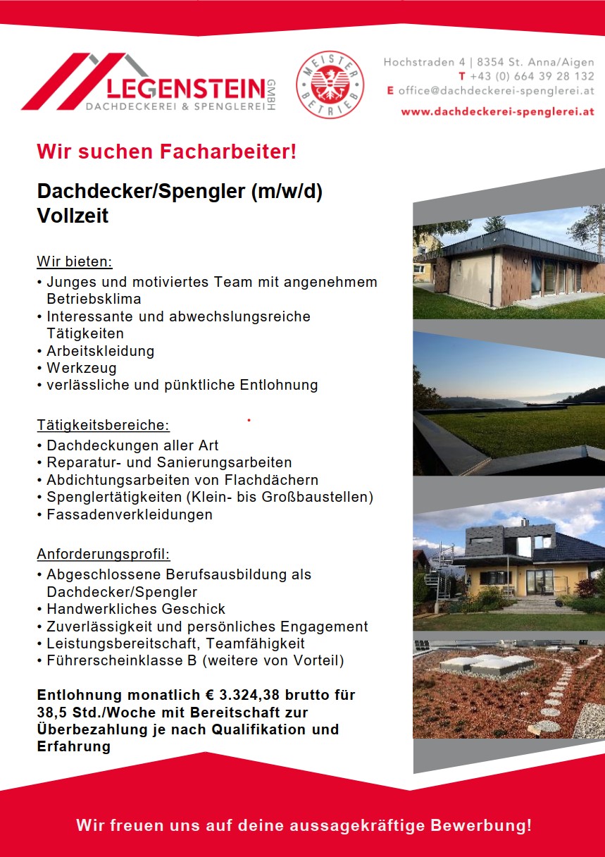 Weil uns wichtig ist, dass unsere KundInnen zufrieden sind, stehen Termintreue, gute Beratung, top Qualität und Flexibilität ebenso wie Liebe zum Detail stets im Fokus der Dachdecker- und Spenglerarbeiten von Legenstein. In einem ersten persönlichen Gespräch finden wir mit Ihnen und/oder Ihrem Architekten/Ihrer Architektin zunächst gemeinsam heraus was für Sie passt! Gerne kommen wir dazu auch zu Ihnen vor Ort zur Besichtigung! Selbst wenn der Hut brennt (etwa bei Sturm- oder Hagelschäden) sind wir zur Stelle und bemühen uns Ihr Anliegen so rasch wie möglich „unter Dach und Fach“ zu kriegen!